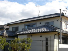 現地は少し山あいの高台にあり屋根からは琵琶湖が一望できます。工事中もあまりの景色に作業の手が止まるほどでした。近隣は昔ながらの純和風住宅が立ち並びます。お施主様はその中で違和感なく現代風なシンプルな外観が調和するようにと色々悩まれたようでした。そこで提案させて頂いたのがこの瓦でした。昔ながらの銀いぶしの質感と少し特徴ある瓦の形状が外観を引き立てています。